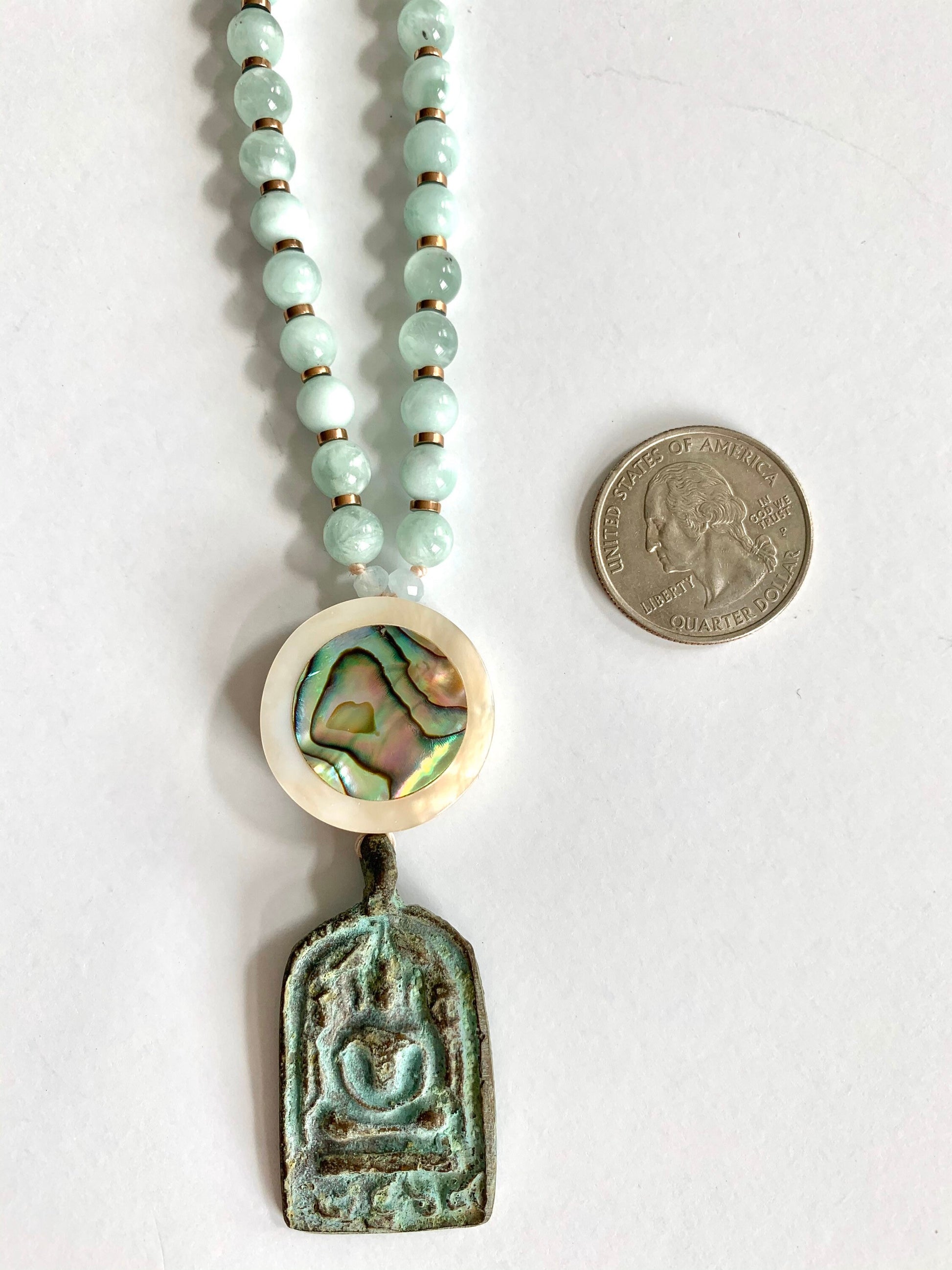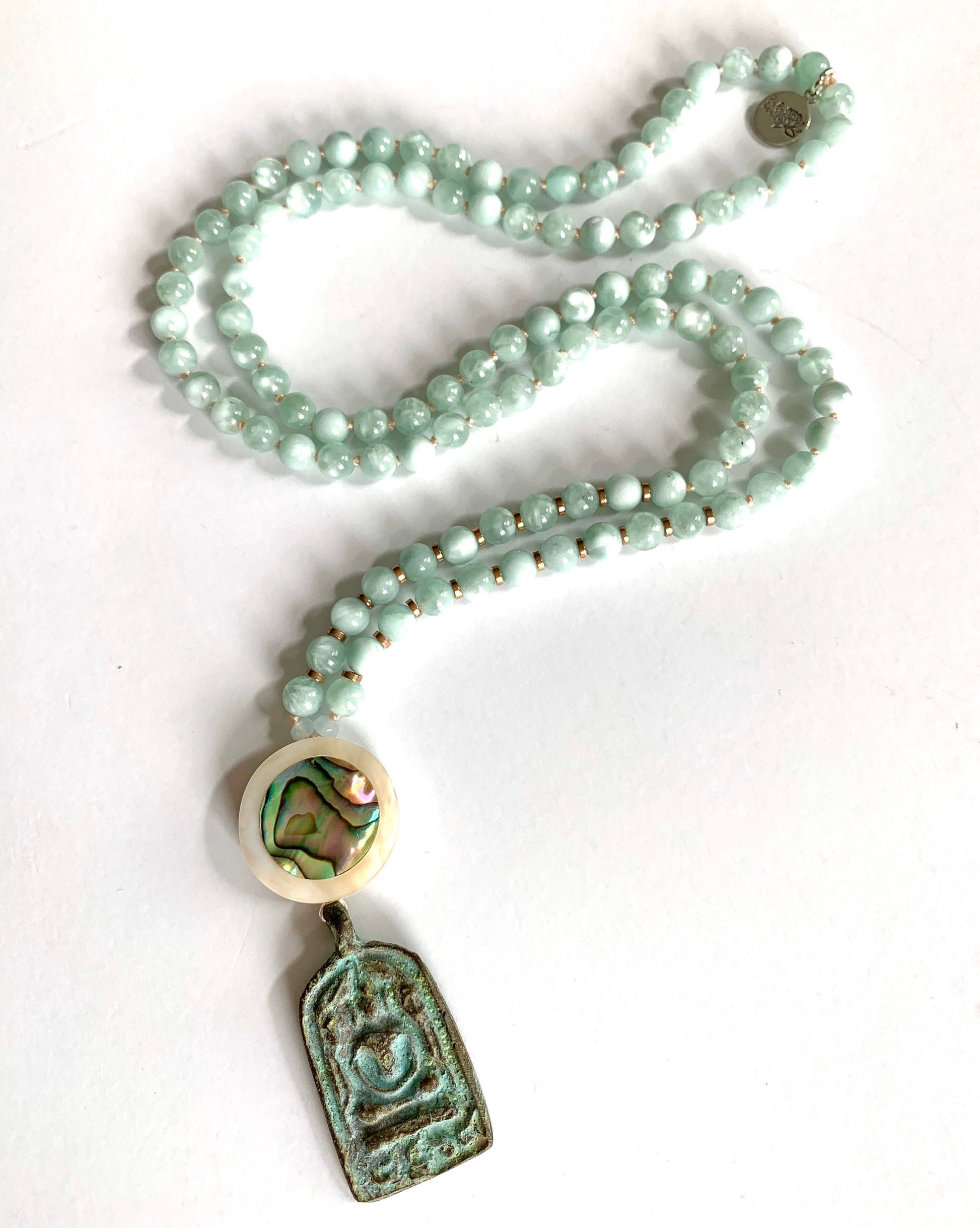 The Peaceful Buddha Mala Necklace is truly one of a kind! This stunning mala necklace is made of rare natural green Angelite gemstone beads that are lovingly knotted by hand. The rose gold plated hematite spacer beads are a lovely accent to the pale green Angelite. The guru bead is made of Mother of Pearl and Abalone. A beautiful patina'd Buddha amulet finishes this mala in place os a tassel. The Peaceful Buddha Mala Necklace makes the perfect gift for yourself or your favorite yogi!