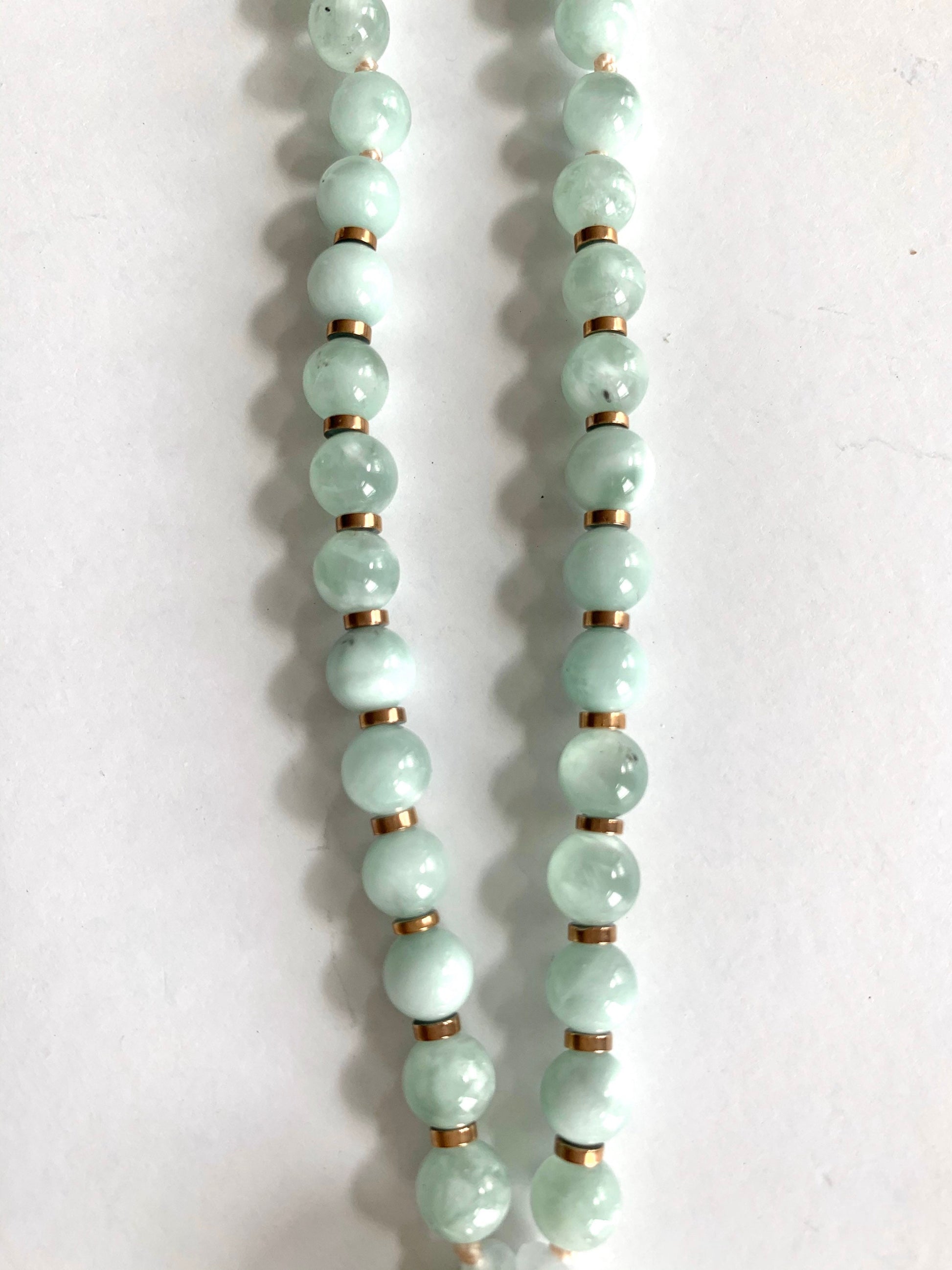 The Peaceful Buddha Mala, Green Angelite, Hematite and Mother of Pearl