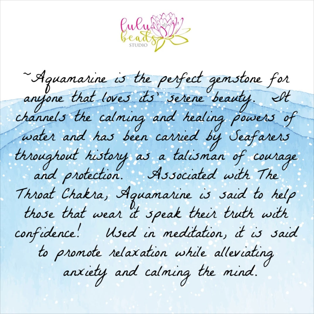 Aquamarine, the birthstone for March, is associated with the throat and heart chakras. Representing water, it clears old energies and that which no longer serves us! Carried by seafarers over millennia, it is strongly associated with courage and helps its wearer speak their truth in a calm, cool and courageous way!