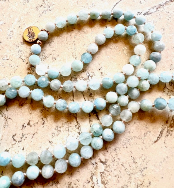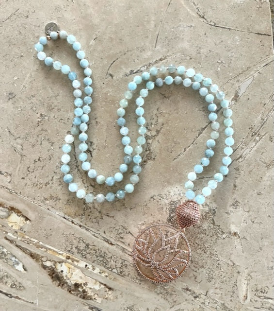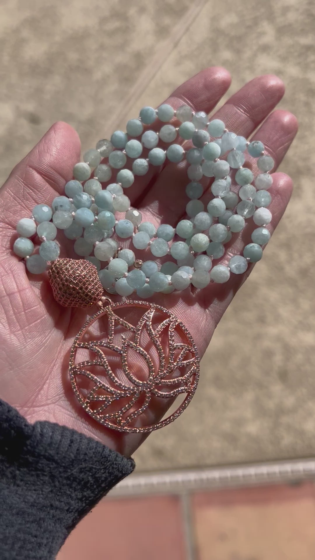 This STUNNING one of a kind Mala necklace is made with 108 6mm faceted natural Aquamarine gemstone beads in various shades of pale blue. They are individually knotted by hand in our Scottsdale AZ studio. Suspended in the center is a unique rose gold filled pave' CZ Guru bead and large open work pave' CZ Lotus flower pendant. The perfect gift for yourself or loved one!
