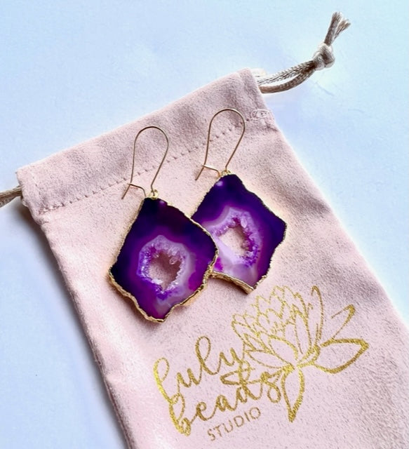 Our striking Agate slice Shakti earrings are made of gorgeous fuchsia pink agate geode slices with gold plated edges. Shakti means "strength" in Sanskrit which is exactly how these gorgeous earrings will make you feel... strong, powerful and beautiful! These lovely handmade earrings have a lovely sparkle and are complementary to all skin tones. Designed to be worn daily, they can be dressed up or down and are the perfect gift for anyone that loves beautiful jewelry!