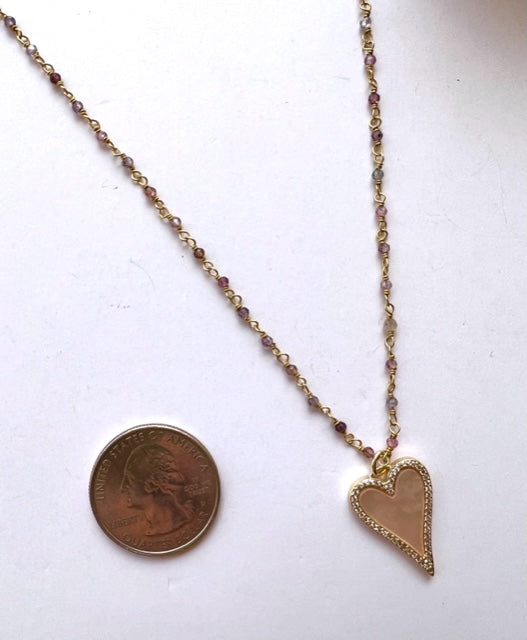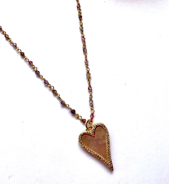 Gorgeous and glittery Yellow Gold Filled handmade necklace with pink Mother of Pearl Heart shaped pendant framed with pave set Cubic Zirconia. The chain is rosary style and handmade of yellow gold filled wire with natural Spinel beads in multiple tones of pink and lavender. The chain is 16" long and perfect for layering with your favorite Mala!