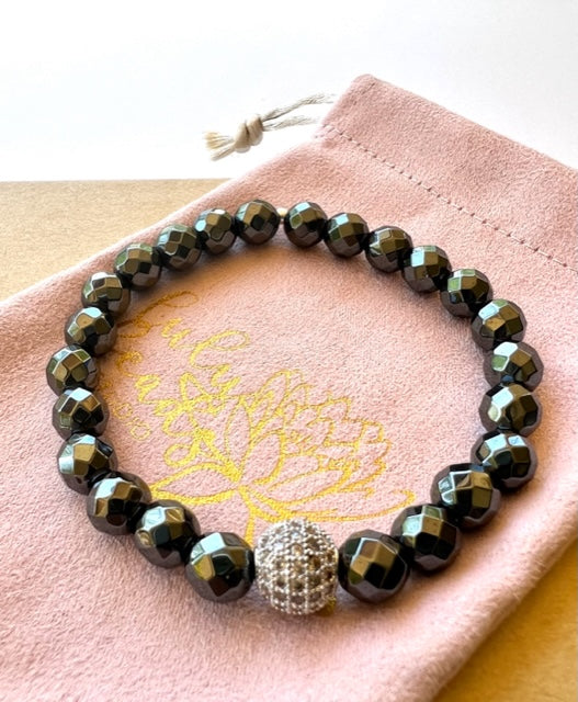 Hematite Mala Bracelet with Pave' Cubic Zirconia Shambala Bead