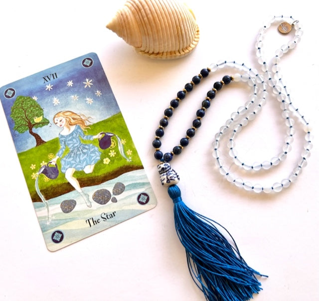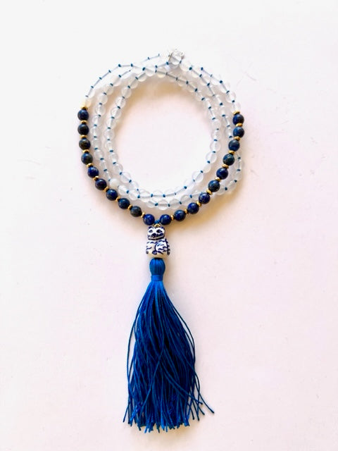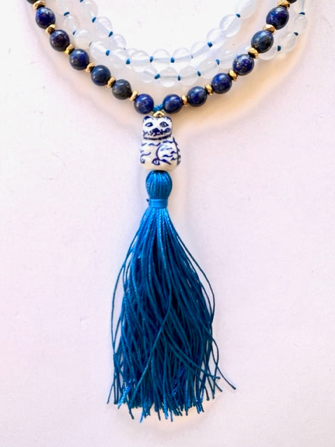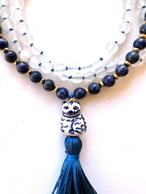 Our Tarot inspired Higher Consciousness Mala is handmade with love and intention. Lapis Lazuli, White Agate and gold plated Hematite rondelles compliment the adorable blue and white ceramic "Lucky Cat" Guru bead. One of our signature handmade silk tassels in royal blue floats gracefully underneath. This striking and unique Mala makes the perfect gift for yourself or loved one!