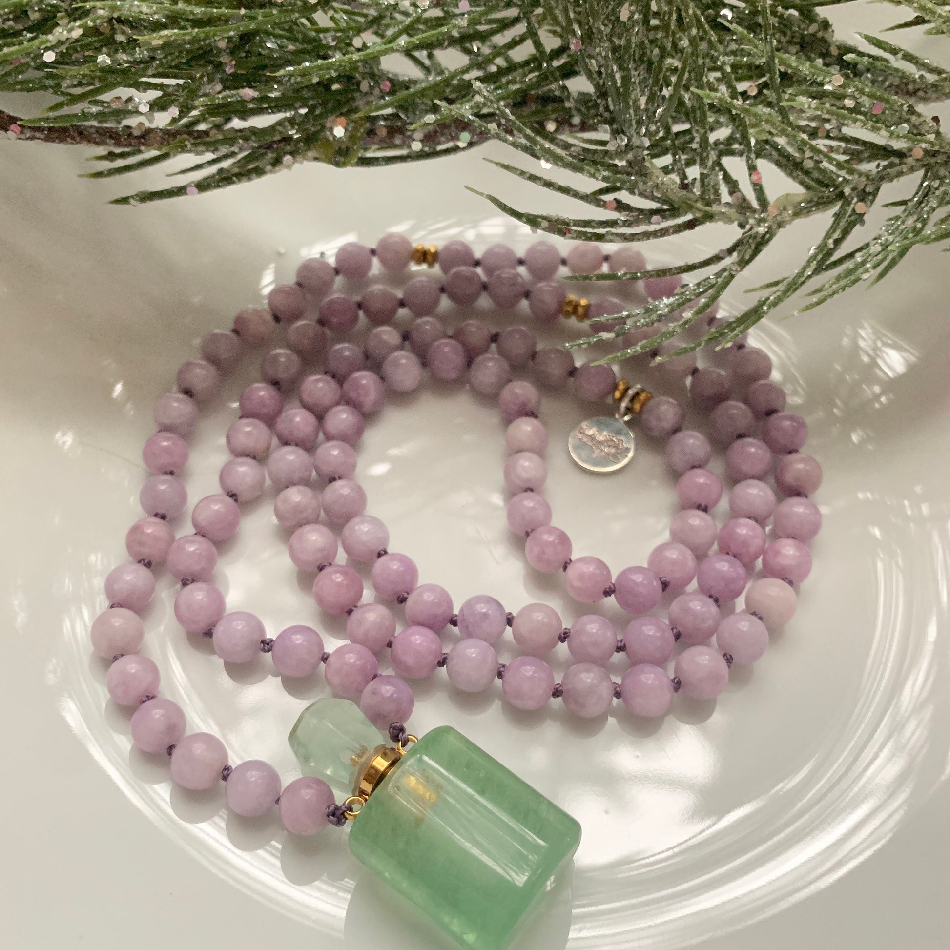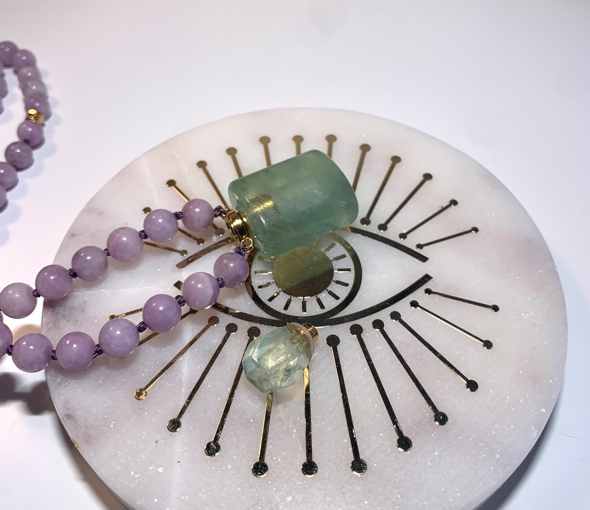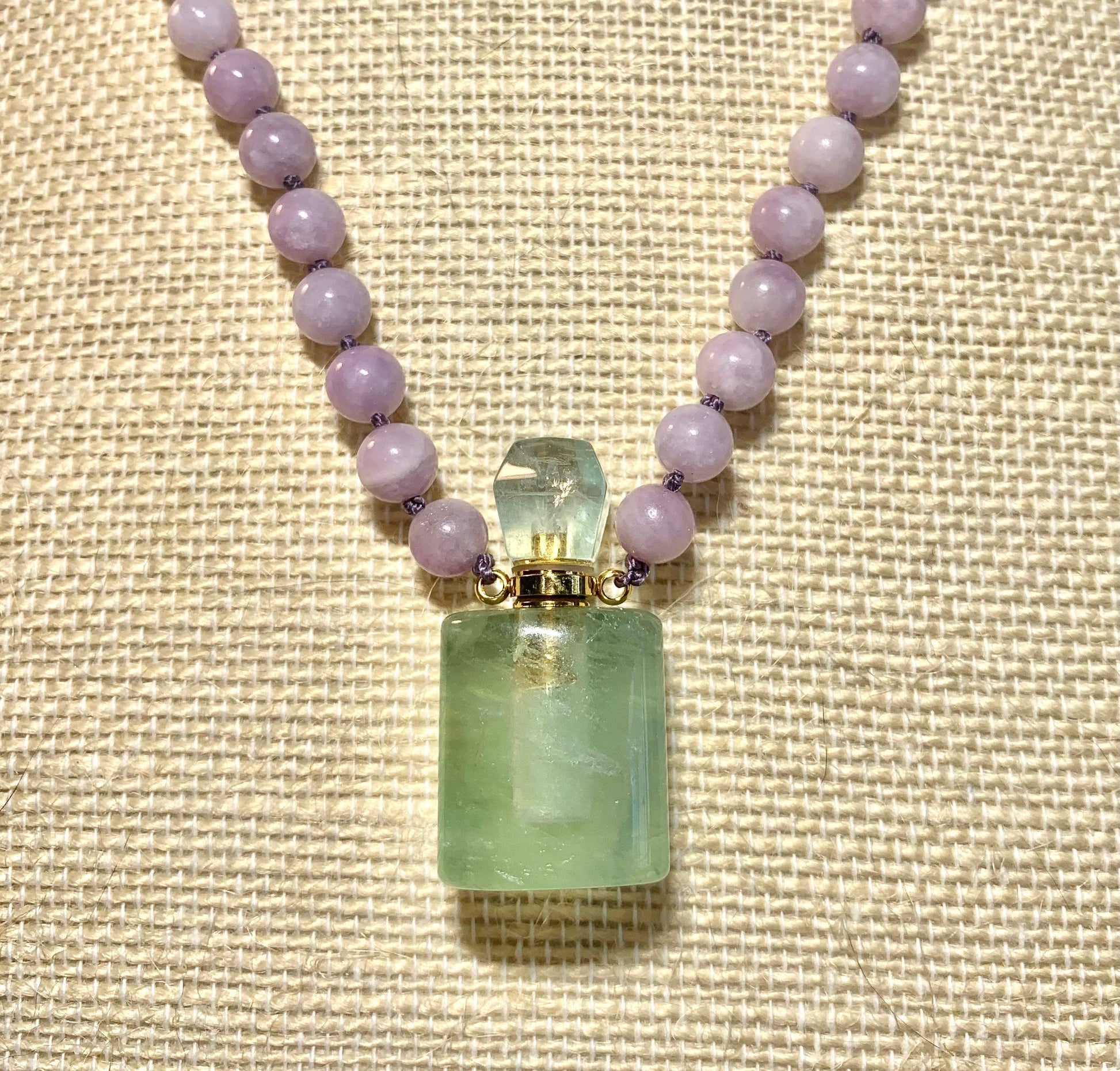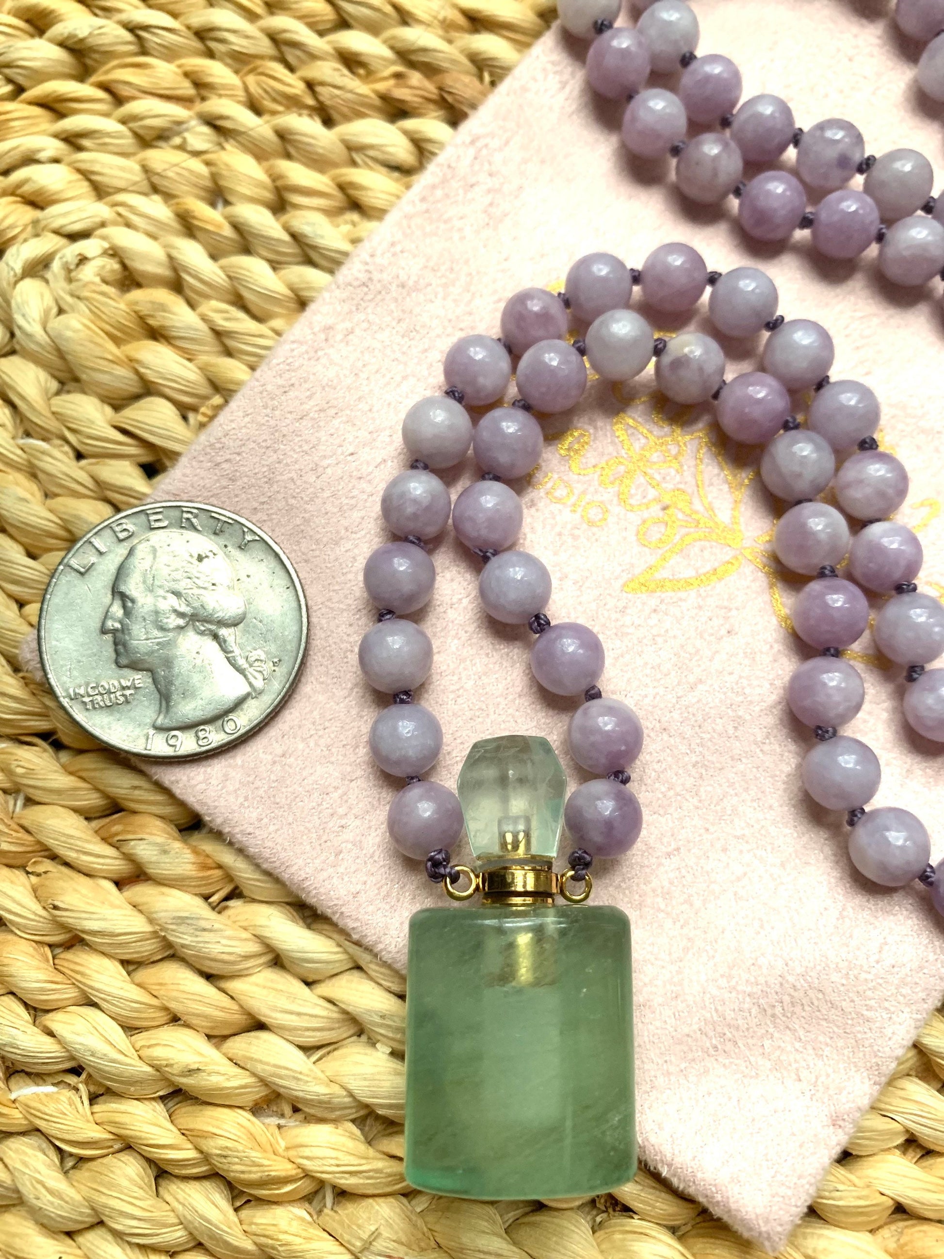 Mala Beads for Peace and Positivity, Lepidolite and Fluorite Miniature Perfume Bottle Pendant