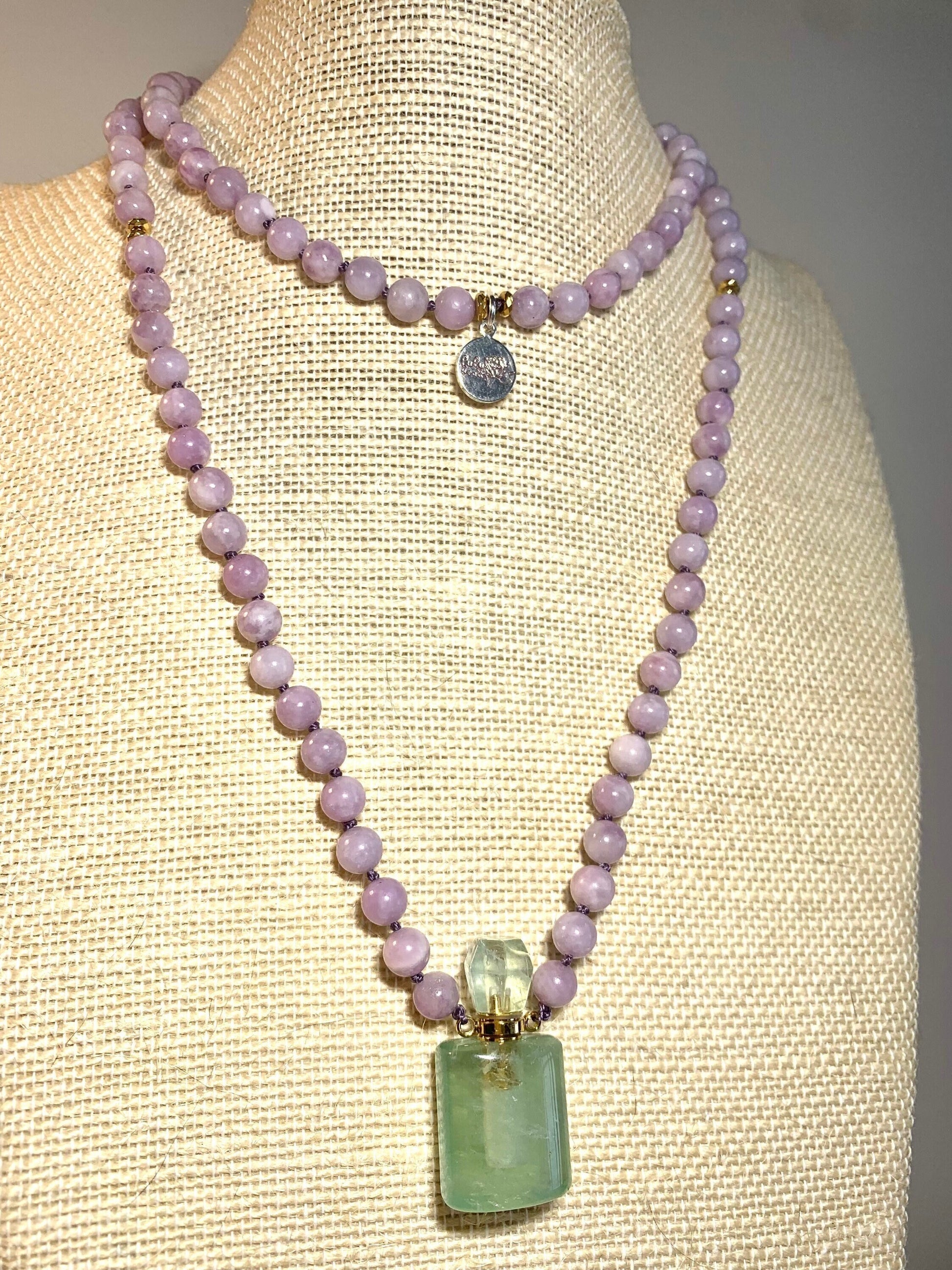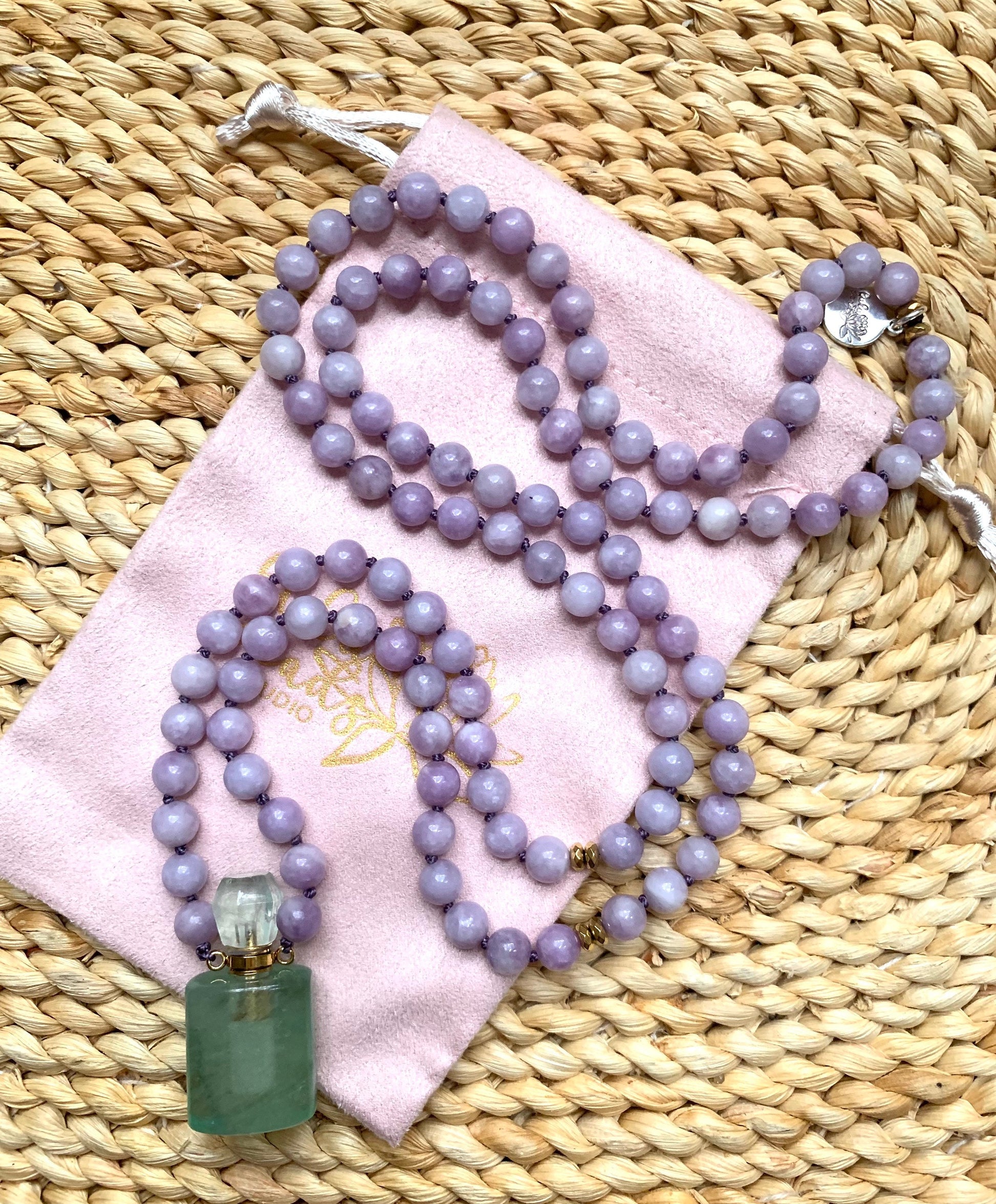 The Peace and Calm mala necklace is made of the loveliest lavender lepidolite gemstone beads that are individually knotted by hand for strength and durability. Gold plated hematite accent beads add a beautiful sparkle and a bit of grounding energy. In place of a tassel and guru bead lies a hand carved fluorite miniature perfume bottle that is not only gorgeous but completely functional! Just add your favorite essential oil and take it anywhere! This stunning and unique mala necklace makes the perfect gift for yourself or your favorite yogi!