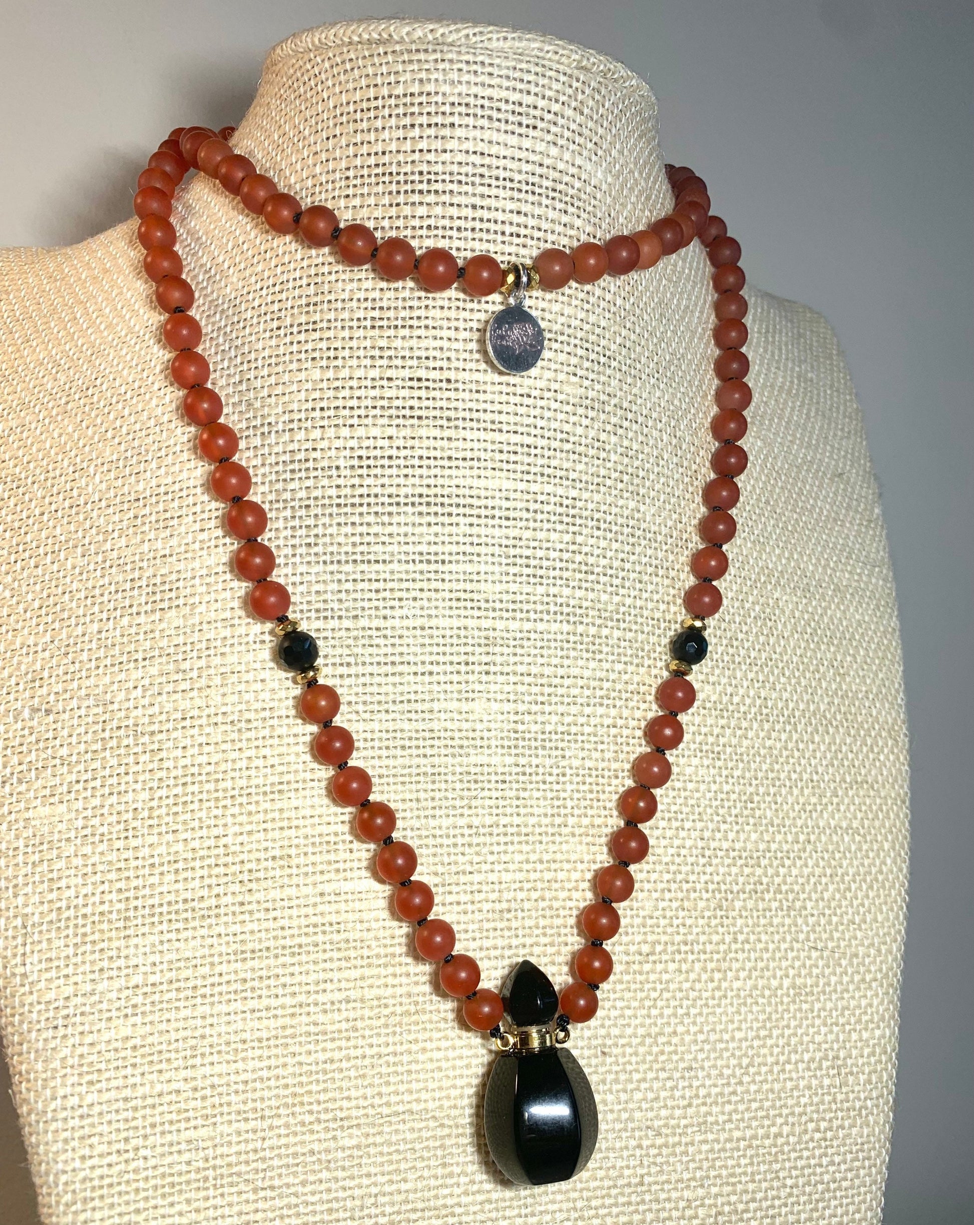 The Life Force Mala, Carnelian, Hematite and Miniature Onyx Perfume Bottle Pendant