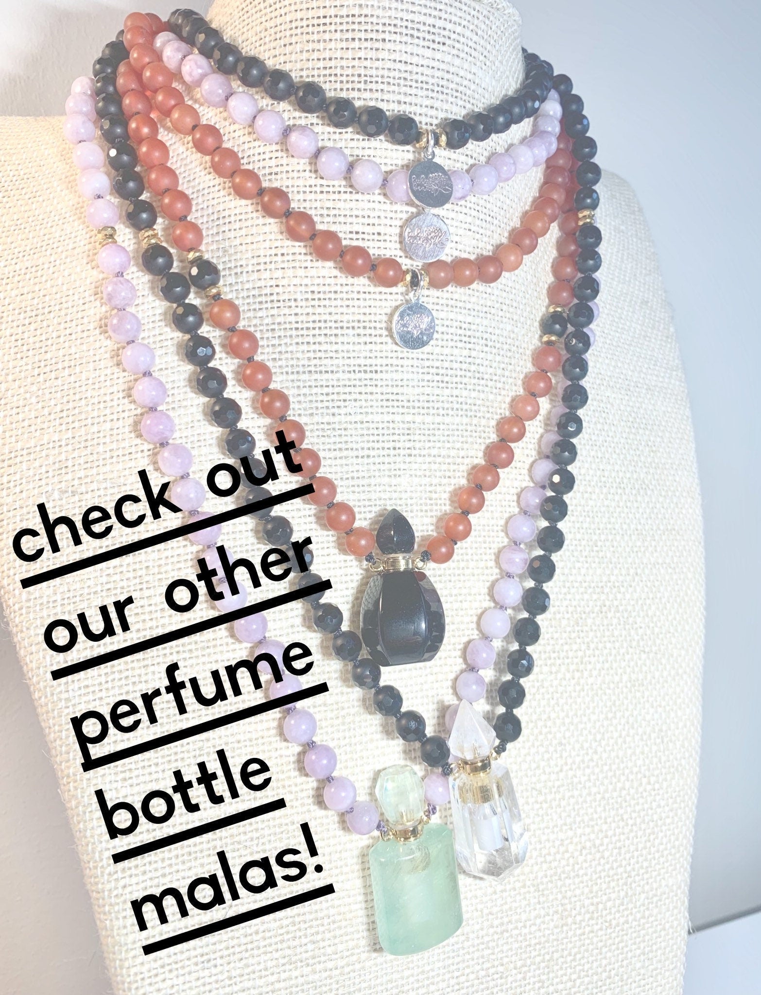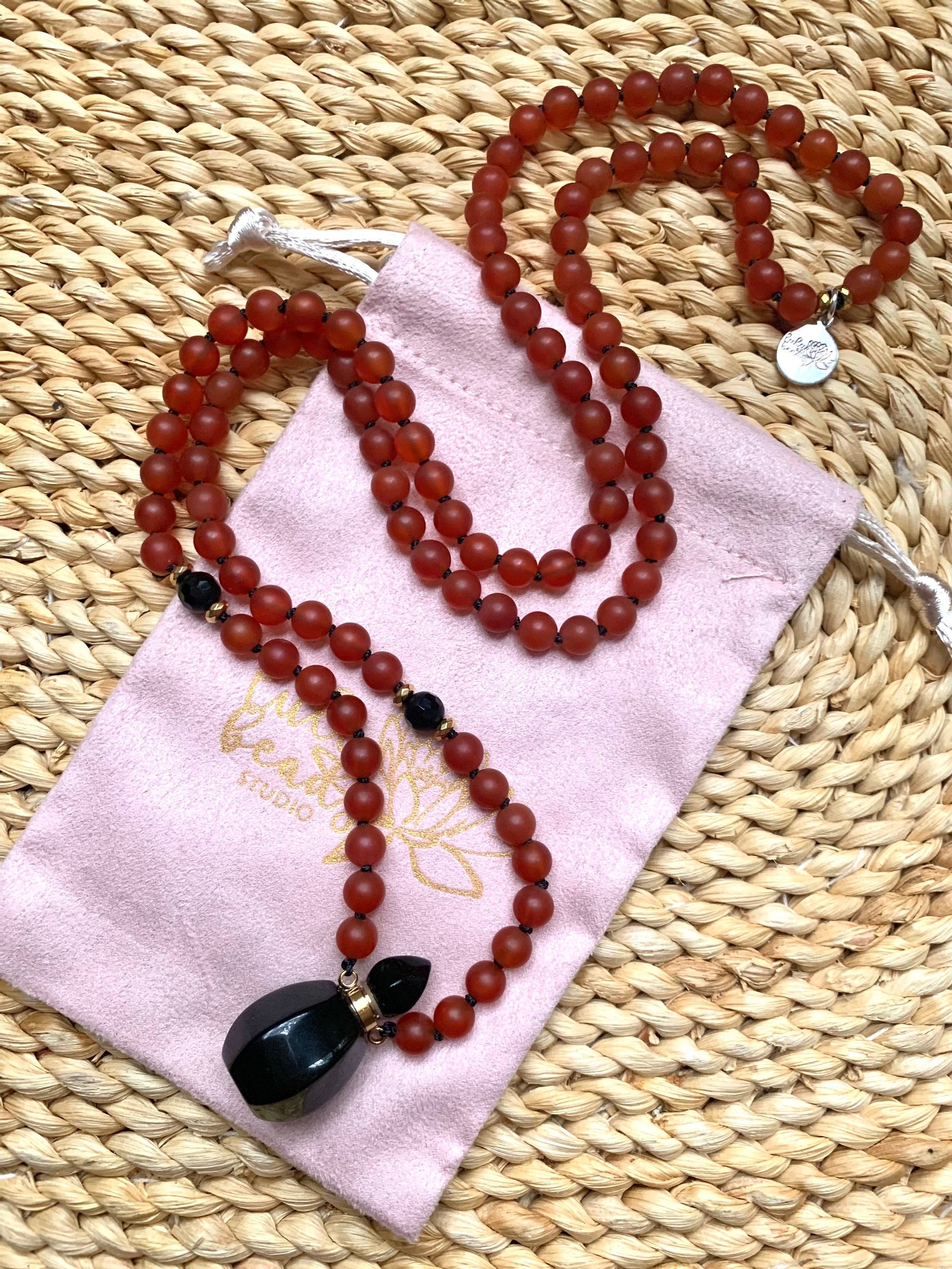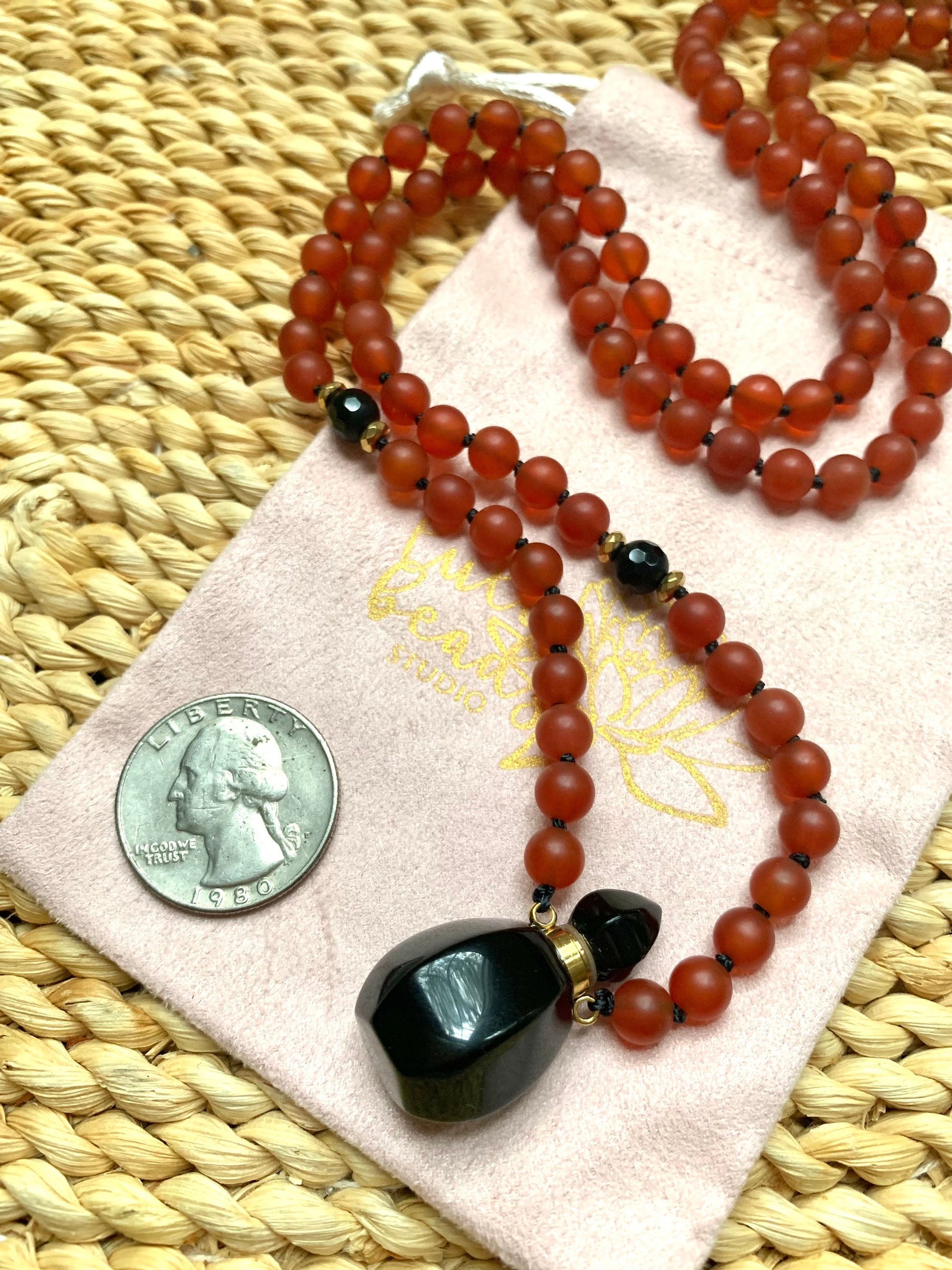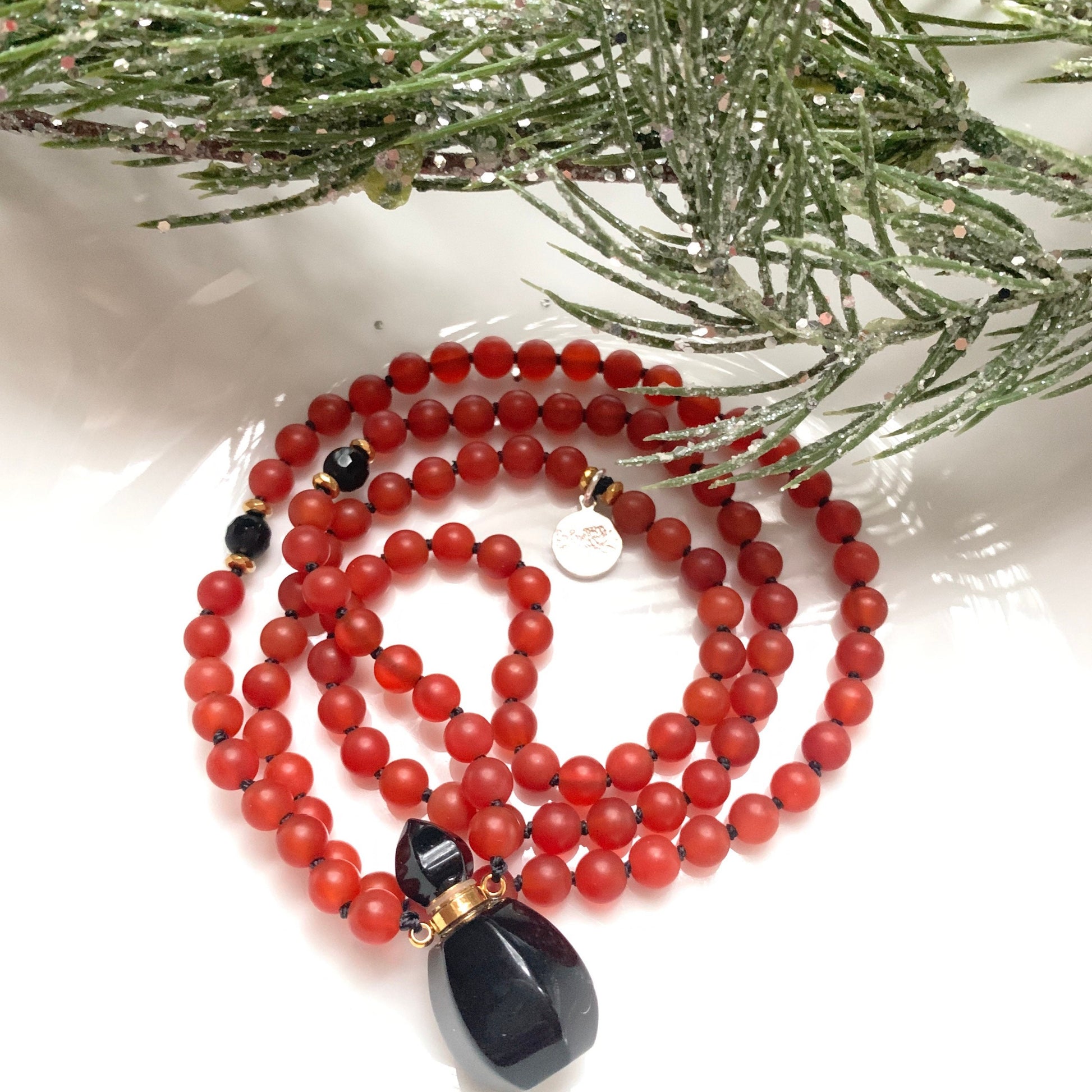 The STUNNING Life Force Mala is made with the loveliest matte finish natural Carnelian gemstone beads. They are individually knotted by hand for strength and durability! Faceted onyx and gold plated hematite beads add sparkle and a bit of calming, grounding energy. Suspended in the center in place of a tassel and guru bead lies a one of a kind carved natural onyx miniature perfume bottle pendant. It is also fully functional, just add your favorite essential oil and take it anywhere! This striking Mala makes the perfect gift for yourself, loved one and favorite yogi!
