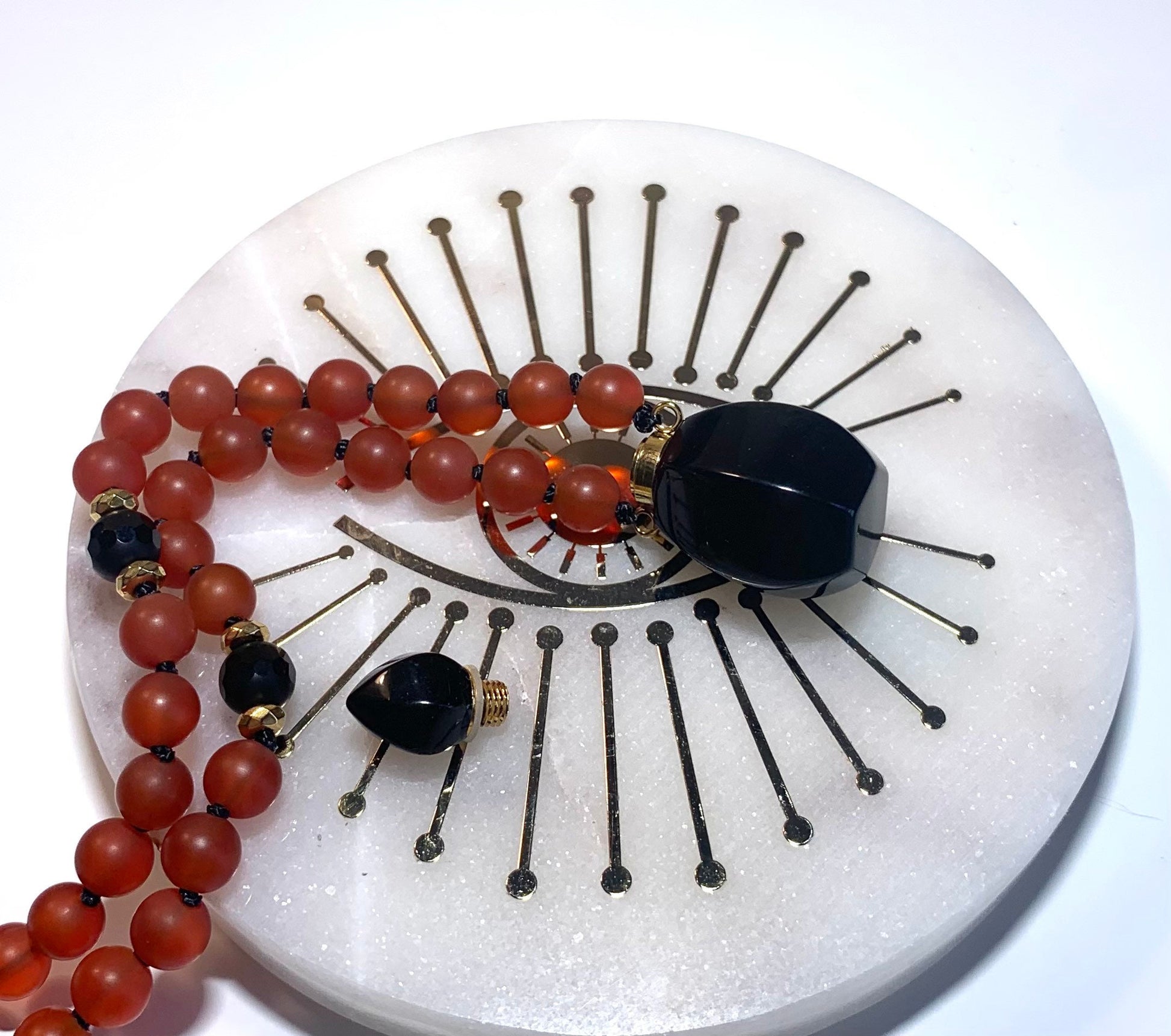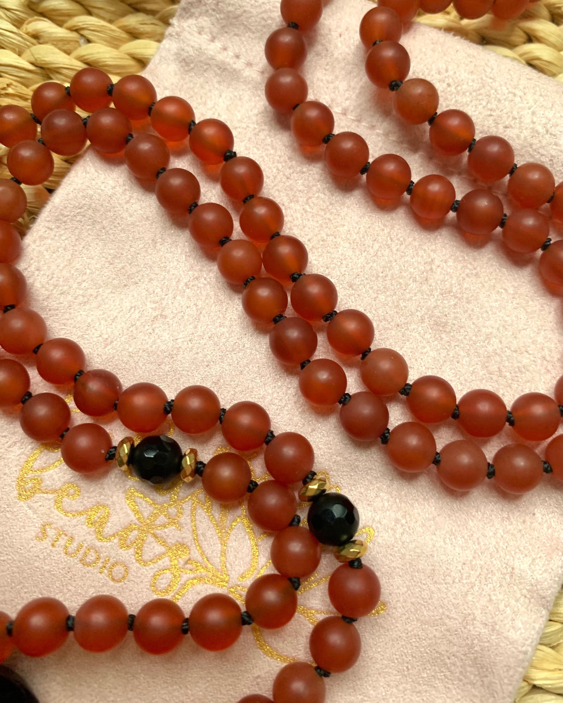 108 hand-knotted Carnelian and Onyx gemstone beads