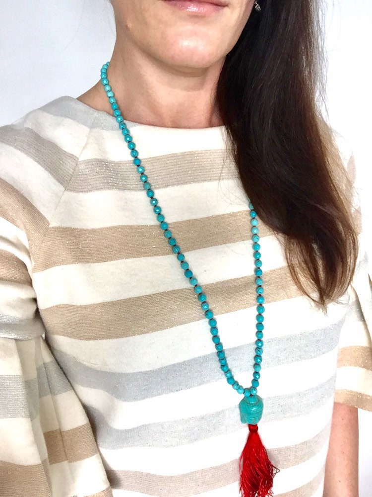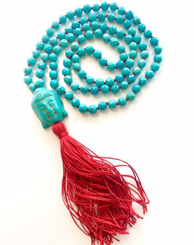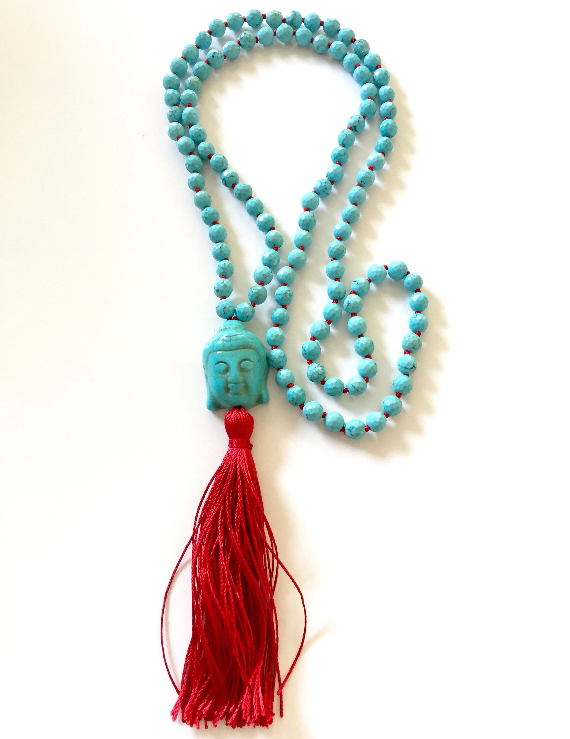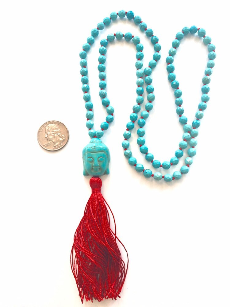 The Sacred Buddha Mala for Good Vibrations is made with 108 Magnesite gemstone beads individually knotted by hand for strength and durability. They are the most beautiful turquoise color and are faceted for a subtle bit of sparkle! Suspended in the center is a charming carved Magnesite Buddha guru bead. A sublime handmade red silk tassel gracefully floats underneath. This striking Mala and powerful enhances positive vibes and creative ideas while promoting a sense of peace and calm. The Sacred Buddha Mala For Good Vibrations makes a great gift for yourself or a loved one!