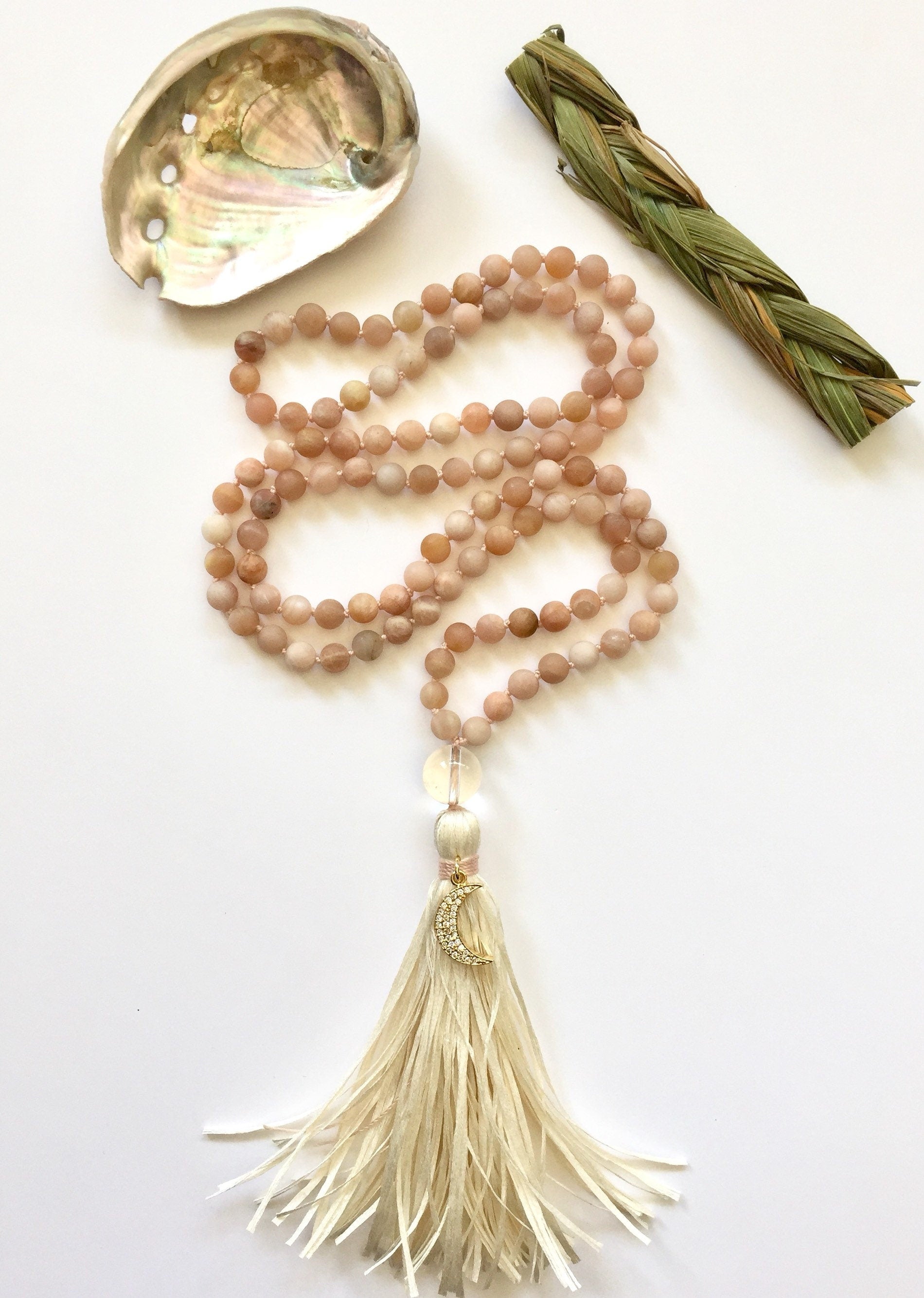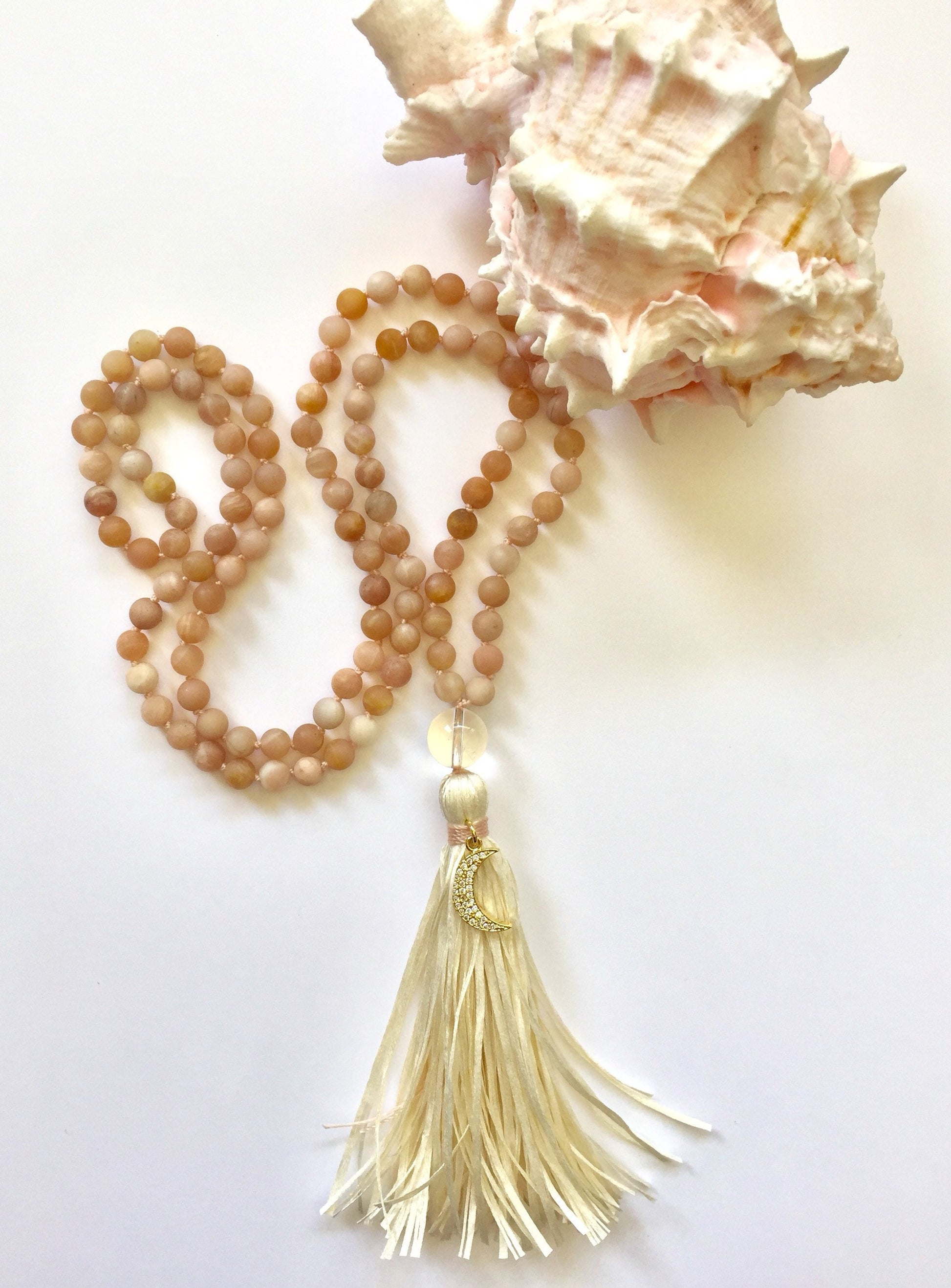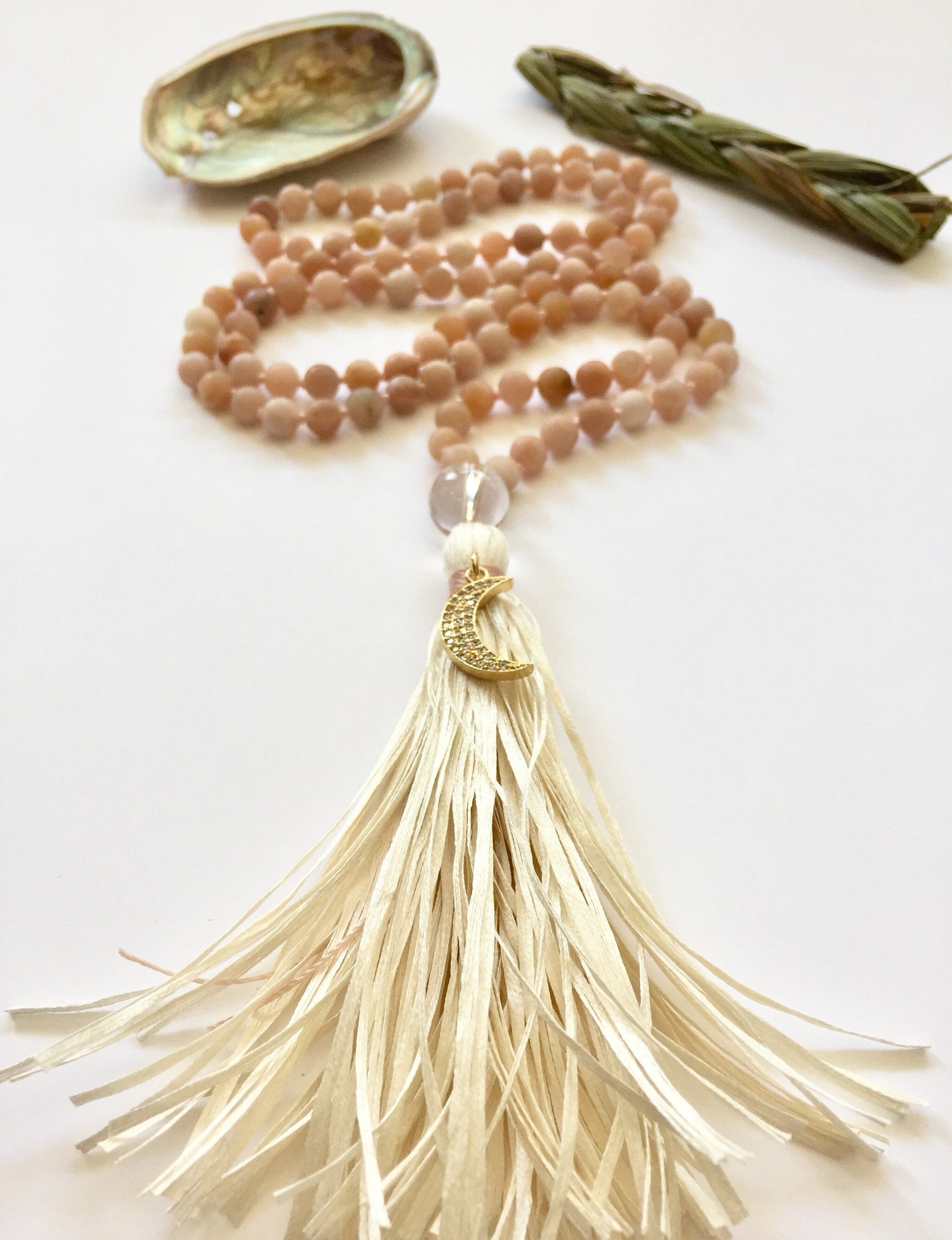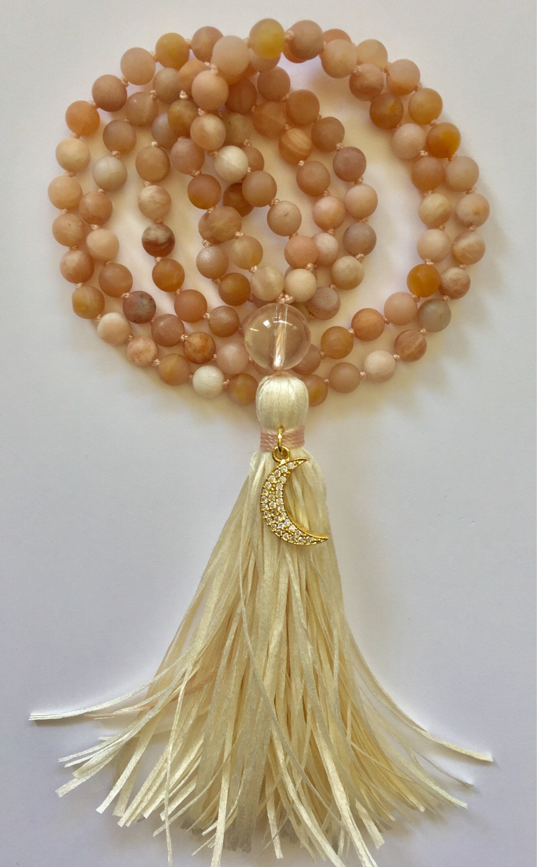 The Ardachandrasana Mala for Joy and Self-confidence is made with 108 6mm Natural Sunstone Gemstone beads. They have a beautiful iridescence and luminosity to them! These joyful beads are individually knotted by hand for strength and durability. Suspended in the center is a natural clear crystal Quartz Guru and a handmade tassel made of cream colored Japanese silk and pave' Cubic Zirconia Moon charm float gracefully underneath. This beautiful Mala is the perfect gift for a loved one or yourself!