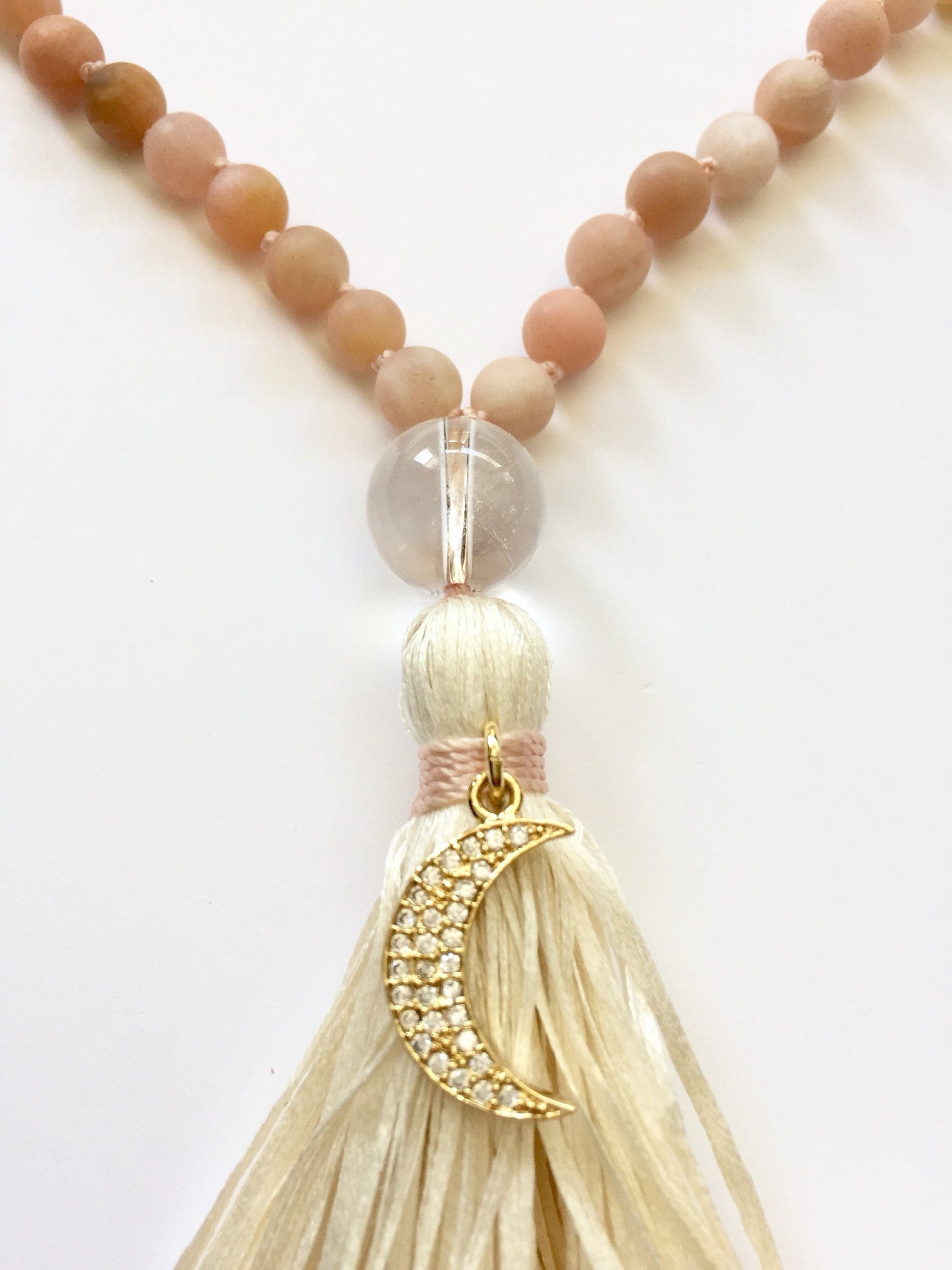 The Mala for Joy and Self Confidence, Sunstone, Quartz and Pave' CZ Moon Charm