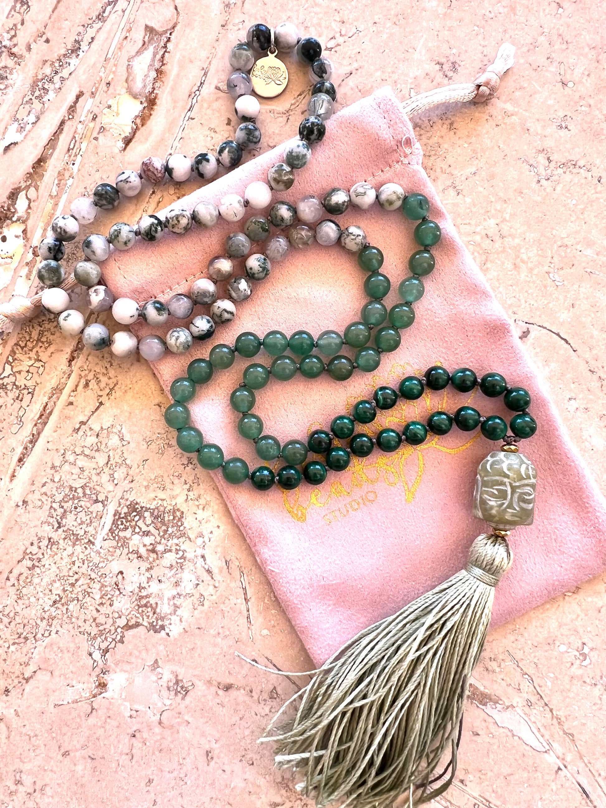 The Manifesting Abundance Mala is made of 108 individually knotted gemstone beads, handmade with love in our Scottsdale Arizona studio. The beads are 6mm and hand selected for their beauty! Made of Tree Agate, Aventurine, Malachite and Jade, this powerful combination balances the heart chakra and brings abundance to its wearer making it an ideal Mala for meditation! The perfect gift for yourself or loved one!