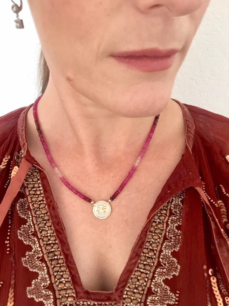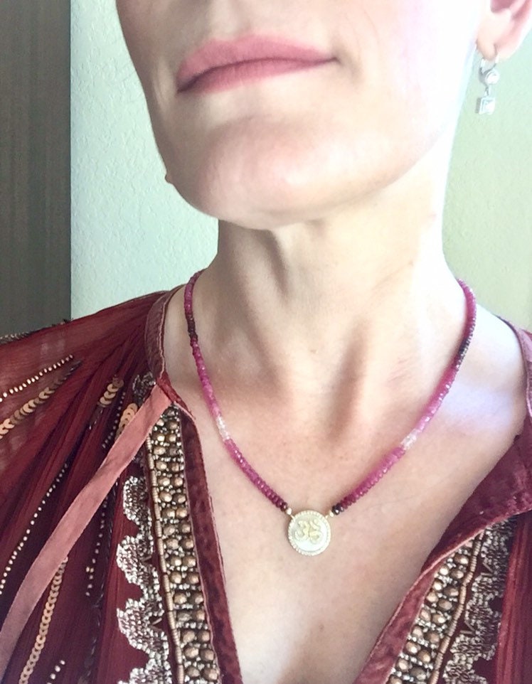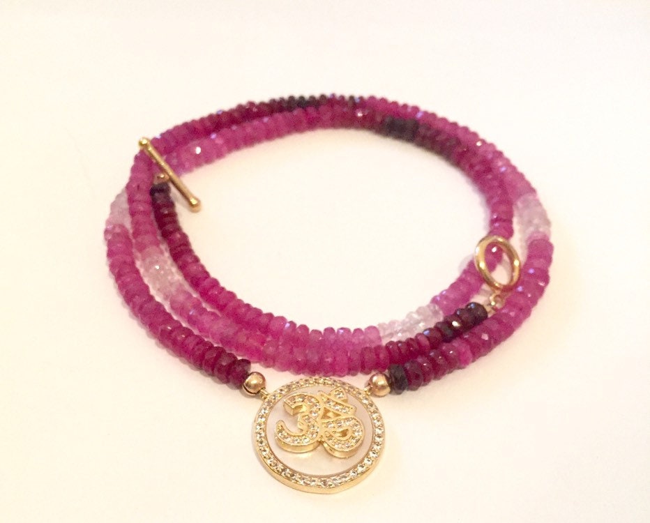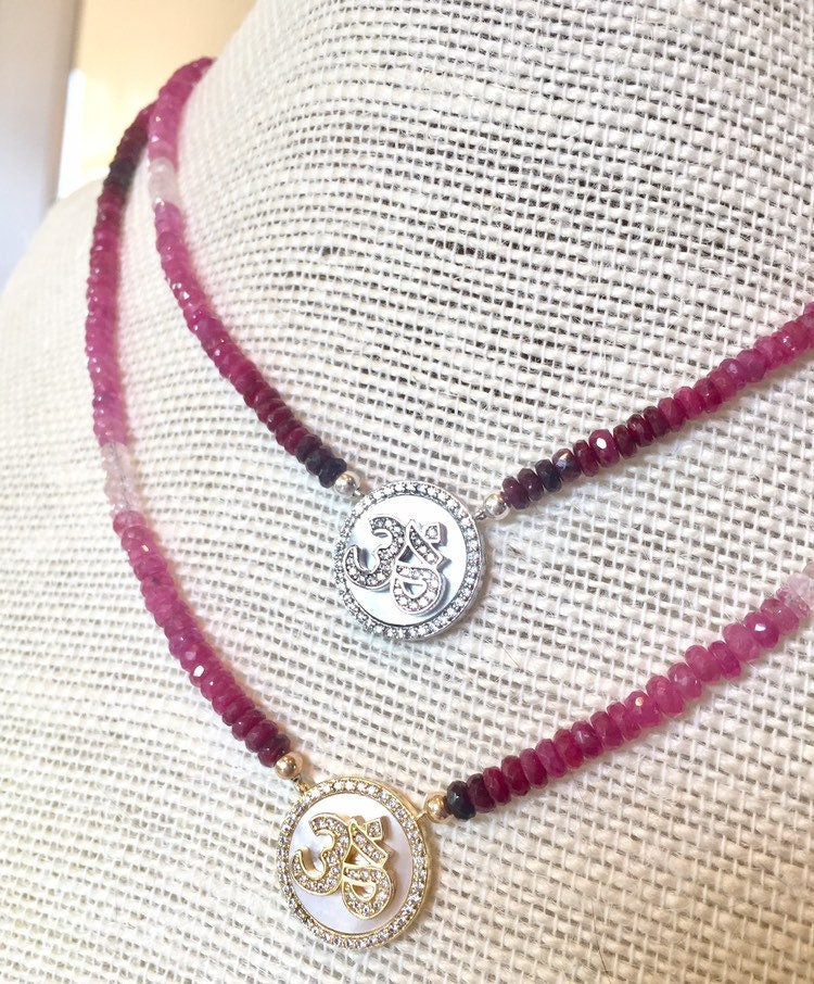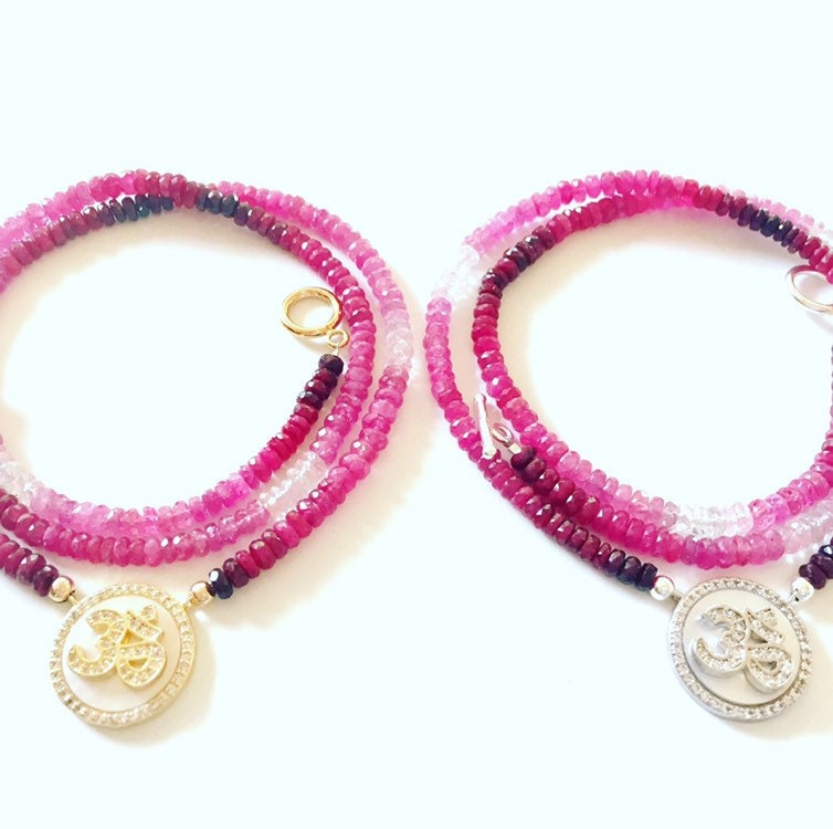 Our Natural Ruby and Pink Sapphire ombre beaded necklace with CZ and Mother-of-Pearl Om pendant is what jewelry dreams are made of! The faceted genuine Ruby and Pink Sapphire rondelle beads are of very fine quality, measure approximately 3.5 mm and sparkle like Dorothy's Ruby slippers! They are the perfect accent to the Om centerpiece pendant, available in Silver or Yellow Gold Filled, both with micro-pave CZ's backed in shimmery Mother-of-Pearl. At 18 inches in length, The Ombre Ruby and Om necklace is perfect for layering or worn on it's own!
