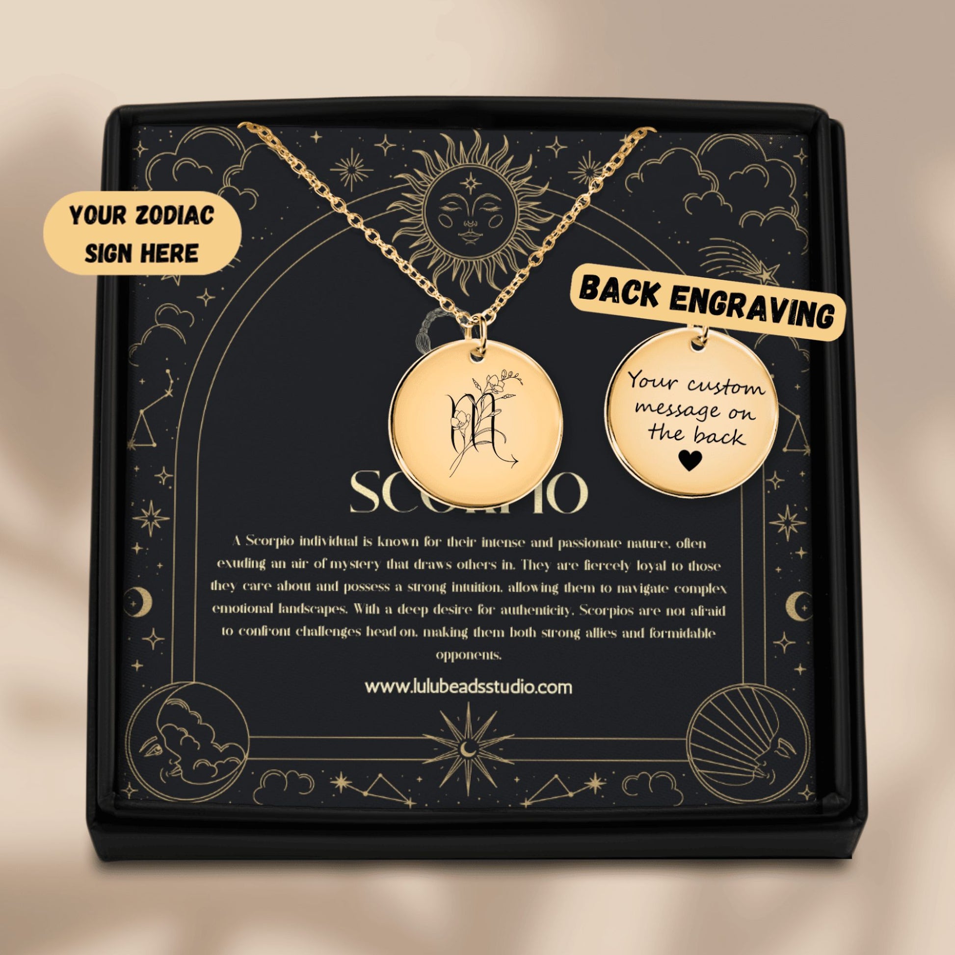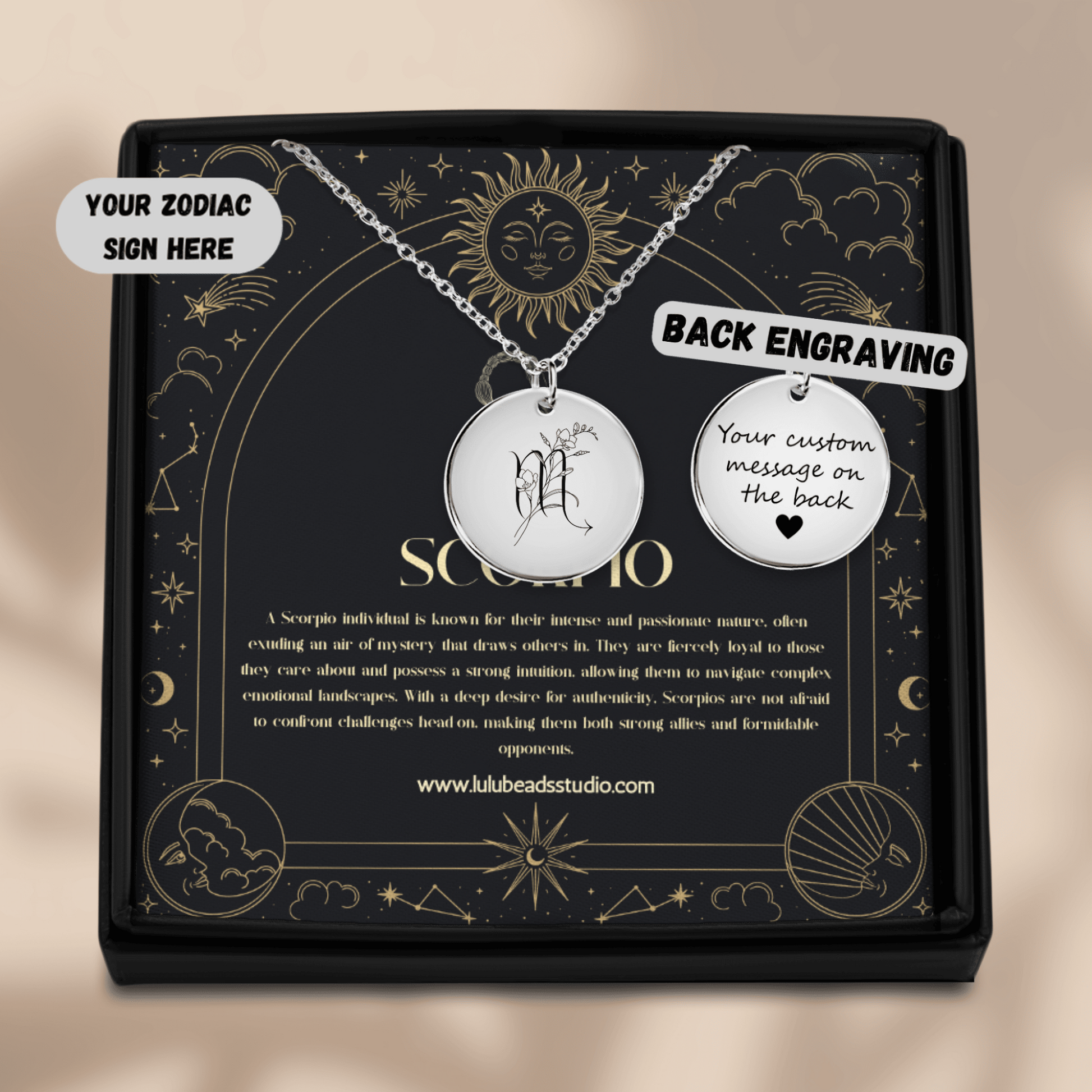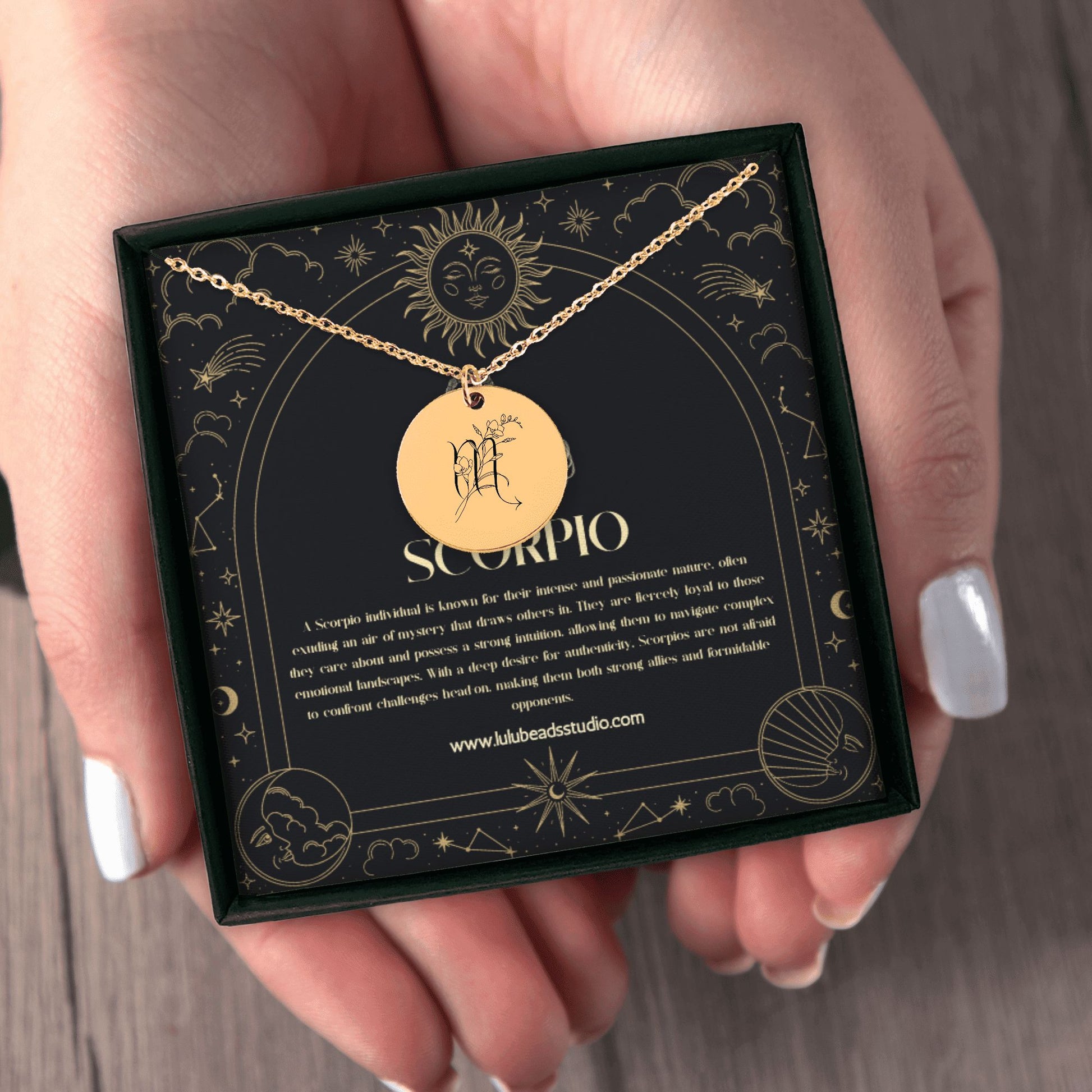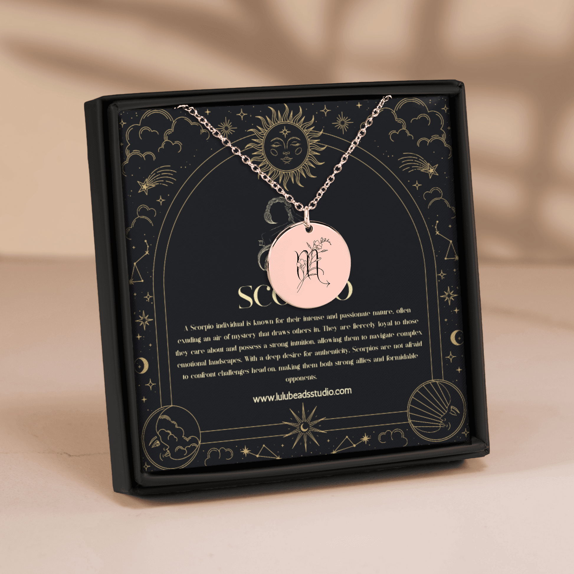 Embrace your inner Scorpio with our exquisite Floral Zodiac Sign Necklace, designed to celebrate the unique spirit of those born under this passionate sign. Measuring 22 inches long, this necklace features a stunning round disc pendant with a diameter of 20mm, elegantly showcasing a beautiful floral Scorpio design.