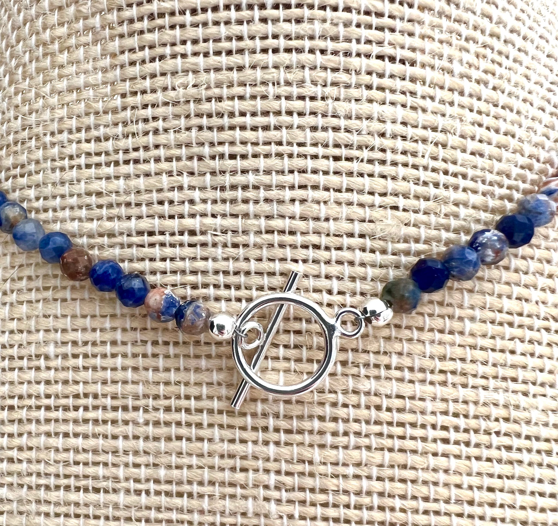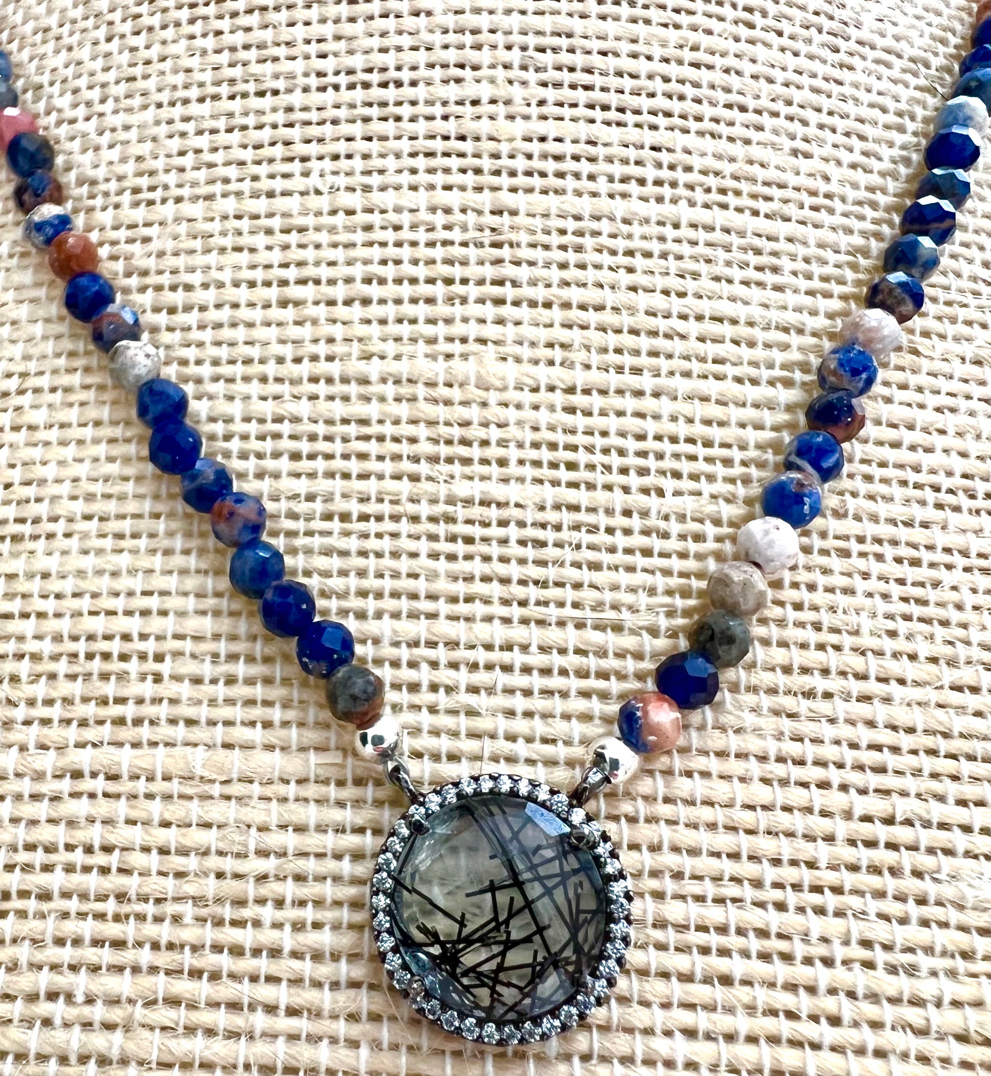 GORGEOUS! This faceted Sodalite beaded choker length (16") necklace has a Rutilated Quartz pendant suspended from the center. Made of blackened silver and framed with pave' set Cubic Zirconia, the Quartz makes a beautiful and unique center piece! The Sterling Silver toggle style clasp finishes this one of a kind handmade necklace. The perfect gift for yourself or loved one!