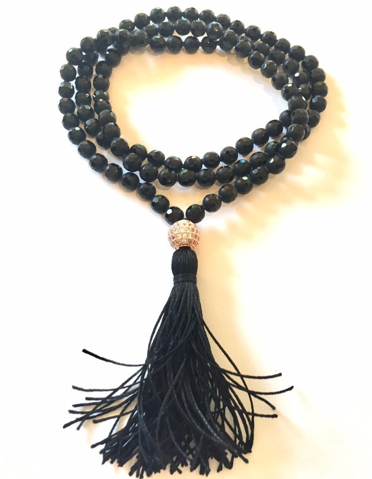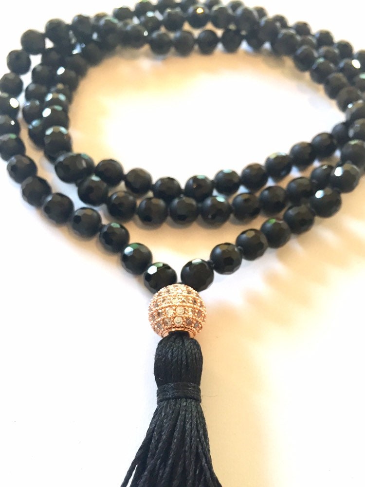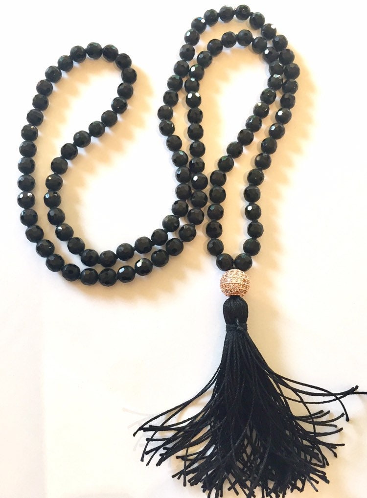 The Stunning Mala For Determination iand Self-Confidence is made with 108 6mm faceted natural Black Onyx gemstone beads. They are individually knotted by hand for strength and durability. Suspended in the center is a lovely 10mm rose gold toned pave' CZ guru bead. A handmade black silk tassel gracefully floats underneath. Feel strong, determined and confident with this striking Mala! The Mala For Determination makes a very special gift for yourself or a loved one!
