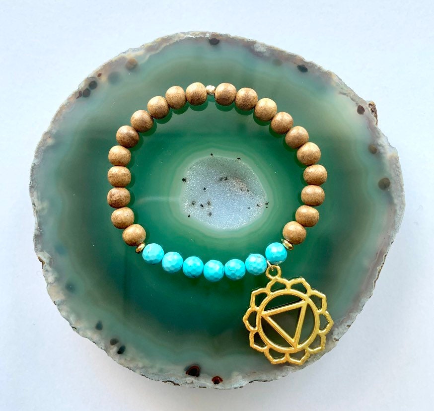 The Throat Chakra (Vishuddha in Sanskrit) balancing bracelet is made of beautiful natural faceted Magnesite beads paired with Sandalwood, Throat Chakra charm and gold plated hematite accent beads. The Throat Chakra, or 4th Chakra, helps one communicate clearly and express themselves. This Mala style bracelet is handcrafted in our studio with love and intention and designed to be worn as a beautiful accessory and used for meditation. "I Speak My Truth" is a powerful Mantra to recite to balance the Throat Chakra. Magnesite helps calm the mind to help one speak their truth and communicate clearly. Sandalwood is both peaceful and soothing, and a traditional choice for Malas. Beautiful Sandalwood is great for meditation and positive vibes. All Lulu Beads Studio Jewelry is cleansed with Sage or Selenite and comes with a beautiful box, pouch and info card on the unique healing energies of the gemstones, all ready for gift giving! 6mm A grade faceted Magnesite beads 6mm Sandalwood beads Throat "Vishuddha" gold-toned chakra charm, approximately 30mm 2 gold-plated hematite accent beads Strung on non-latex durable stretch cord 7 inches long, please add a note if a different length is needed (please note, additional length can take an additional 2 weeks)